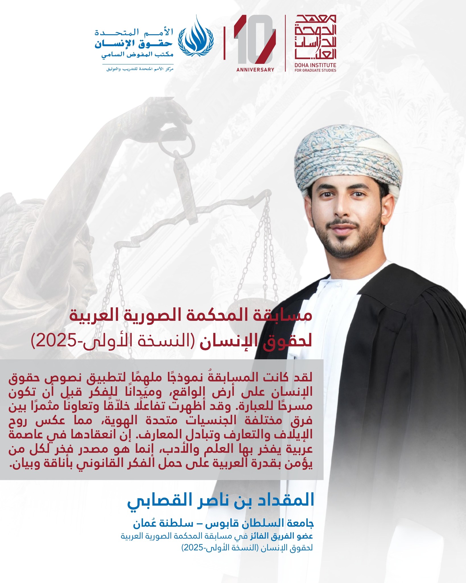 المسابقة العربية الإقليمية للمحاكم الصورية لحقوق الإنسان هي مسابقة سنوية ينظمها المركز بهدف تعزيز فهم طلاب الجامعات لمبادئ حقوق الإنسان ومصادرها ومعاهداتها، وتفاعلهم مع الآليات الدولية لحقوق الإنسان. توفر هذه المسابقة منصة عملية وتفاعلية لتطوير مهارات البحث والتحليل والمناصرة القانونية، وتشجيع الحوار حول قضايا حقوق الإنسان الراهنة، وبناء شبكة إقليمية من الطلاب الملتزمين بتعزيز حقوق الإنسان وسيادة القانون. بالتعاون مع جامعات في المنطقة العربية، تهدف مسابقة المحاكم الصورية إلى تعزيز تفاعل الطلاب مع الآليات الدولية لحقوق الإنسان، وزيادة معرفتهم بالقانون الدولي، وكذلك القانون الدولي لحقوق الإنسان، بين طلاب الجامعات في المنطقة العربية. ويتحقق ذلك من خلال توفير منصة تعليمية تفاعلية تتيح لهم تطبيق المبادئ القانونية في بيئة مهنية تحاكي الواقع.
