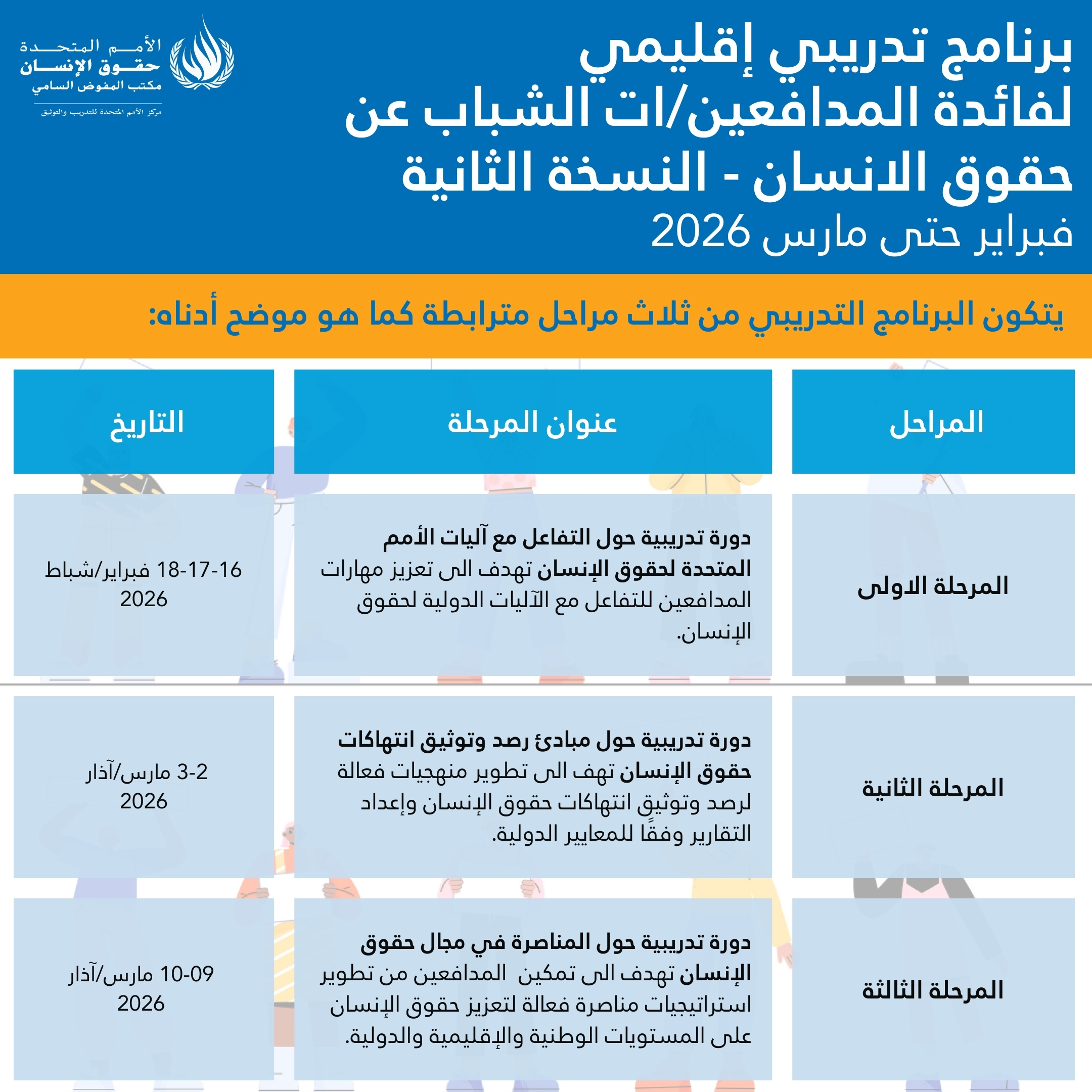 دورة ﺗﺪرﻳﺒﻴﺔ ﻟﻠﻤﺪاﻓﻌﺎت واﻟﻤﺪاﻓﻌﻴﻦ اﻟﺸﺒﺎب/ات ﻋﻦ ﺣﻘﻮق اﻹﻧﺴﺎن ﺗﻌﻤﻞ ﻋﻠﻰ ﺗﻌﺰﻳﺰ ﻗﺪرات اﻟﺸﺒﺎب/ات ﻓﻲ اﻟﺪﻓﺎع ﻋﻦ ﺣﻘﻮق اﻹﻧﺴﺎن وﻋﻠﻰ اﻟﺘﻔﺎﻋﻞ ﻣﻊ ﻫﻴﺌﺎت ﺣﻘﻮق اﻹﻧﺴﺎن اﻟﺘﺎﺑﻌﺔ ﻟﻸﻣﻢ اﻟﻤﺘﺤﺪة وآﻟﻴﺎﺗﻬﺎ وإﺟﺮاءاﺗﻬﺎ .