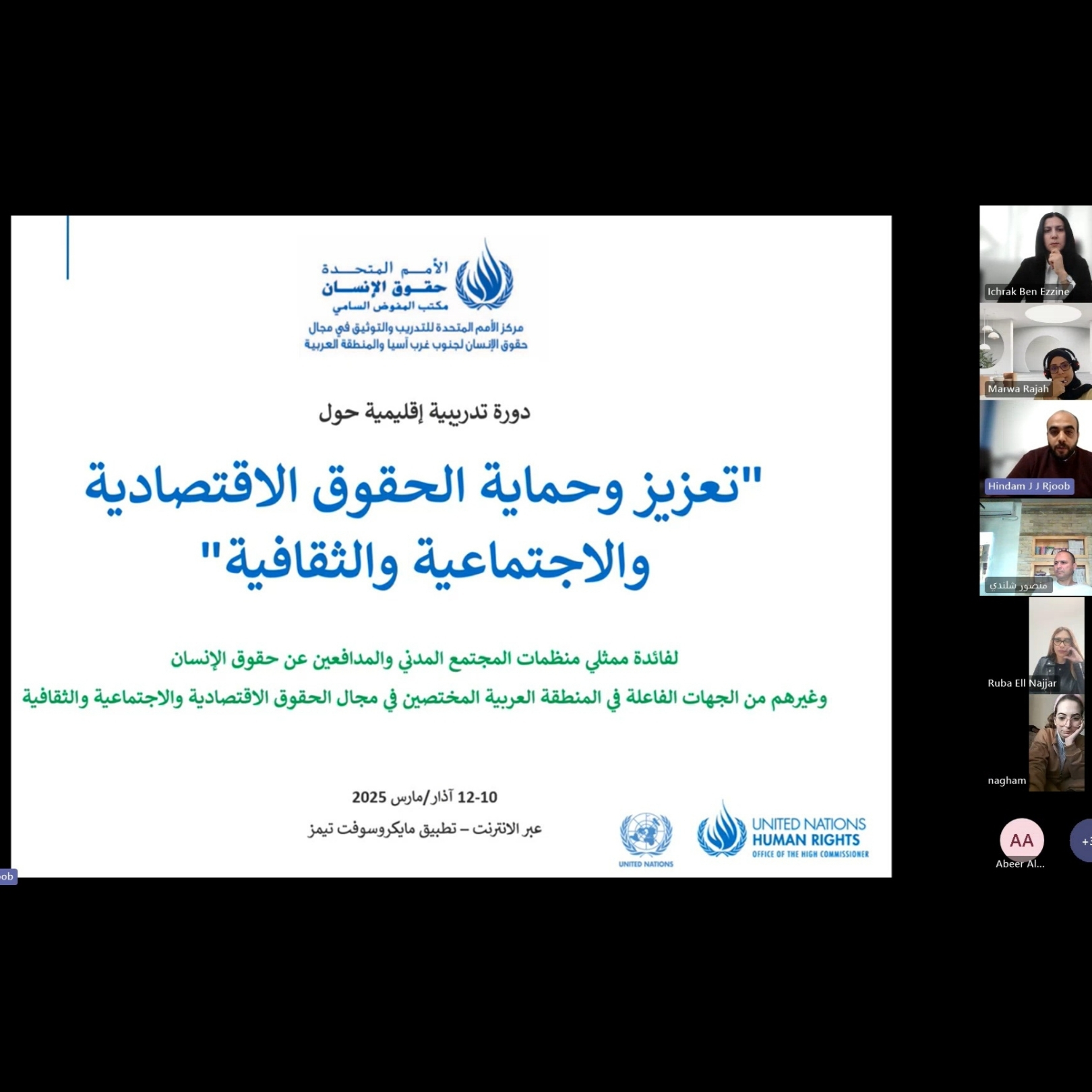 نظم المركز دورة تدريبية إقليمية عبر الانترنت لمدة ثلاثة أيام بعنوان "تعزيز وحماية الحقوق الاقتصادية والاجتماعية والثقافية" لصالح منظمات المجتمع المدني والمدافعين عن حقوق الإنسان وغيرهم من أصحاب المصلحة في المنطقة العربية.